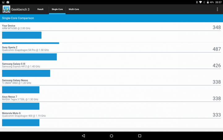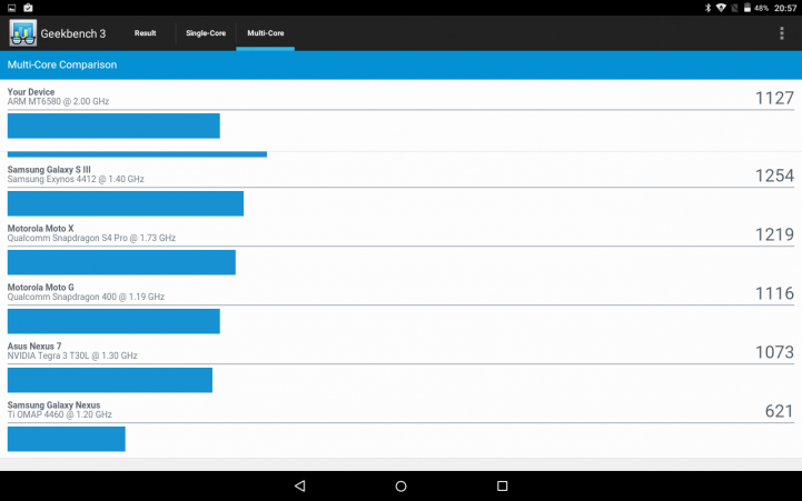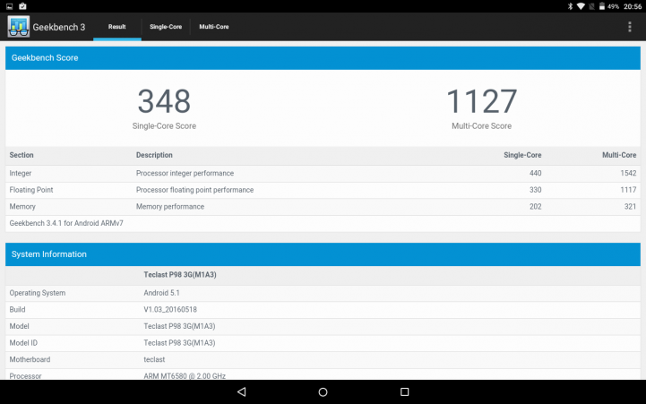Geekbench 3の測定結果は以下の通り。こちらもシングルコア、マルチコアともにスペック通りの数値に落ち着きました。